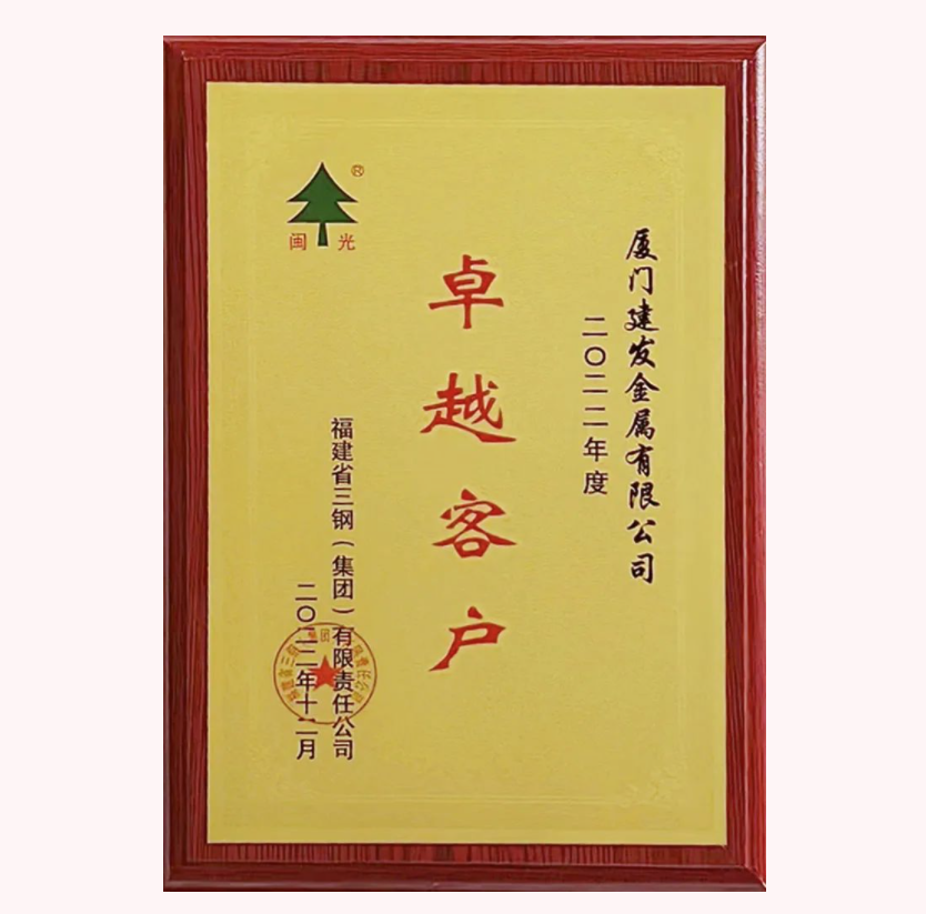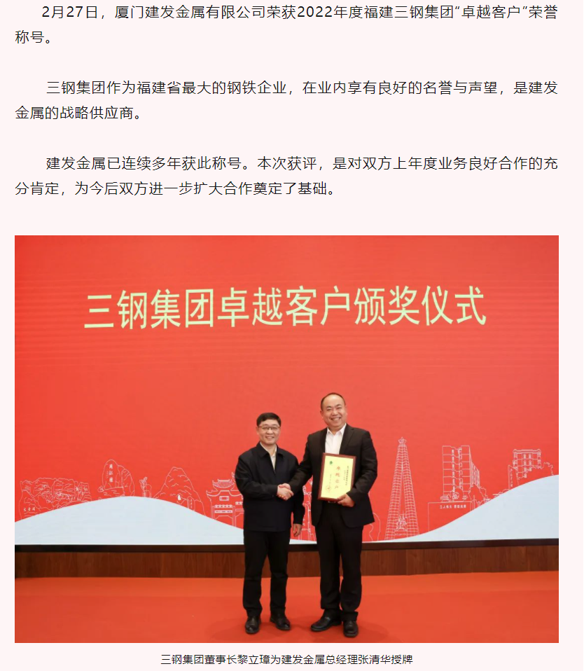 建發(fā)金屬獲評三鋼集團(tuán)“卓越客戶”榮譽(yù)稱號